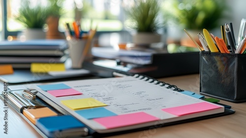 Organized Workspace: Desk with Planner and Sticky Notes