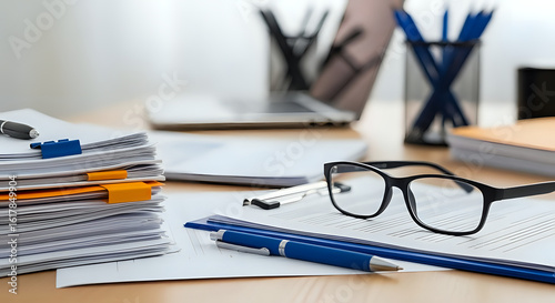 Organized workspace with stacks of documents, glasses, pen, and laptop for focused business productivity
