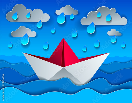 Origami paper ship toy swimming in rain over ocean, curvy waves of the sea and clouds in the sky, beautiful vector illustration in paper cut style.