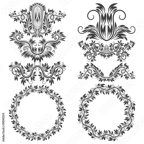 Ornamental elements and patterned round frames for design. Floral tattoo in vintage style.