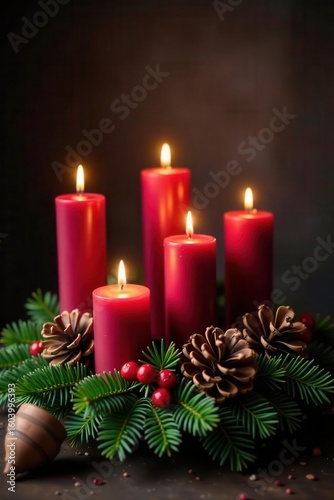 Ornate advent wreath with four candles, pine cones, and berries , candles, season, countdown