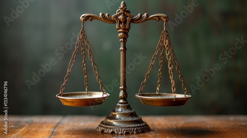 Ornate brass balance scales of justice stand gracefully on a rustic wooden table, embodying fairness and equilibrium against a muted green background