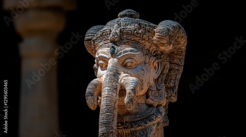 Ornate elephant-headed figure, ancient carved statue against dark wall