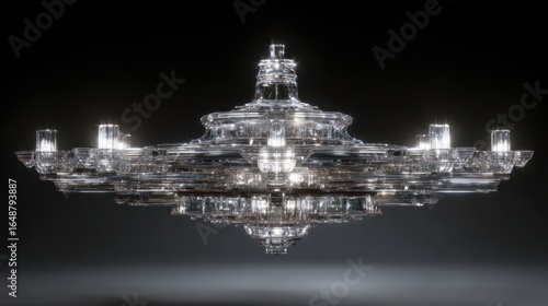 Ornate glass chandelier with multiple tiers, faceted and shining under bright light