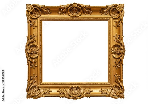 Ornate golden picture frame with detailed carvings and a blank white center on a white background