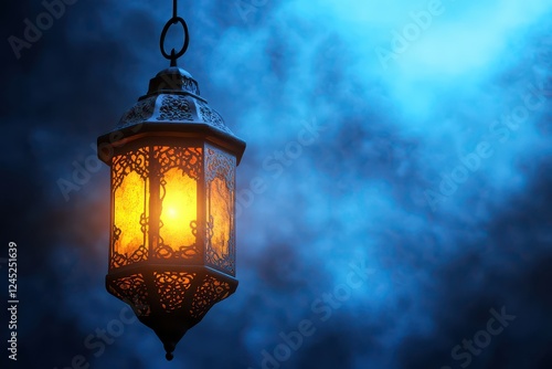 Ornate lantern glowing warmly against a misty blue background, evoking a serene atmosphere
