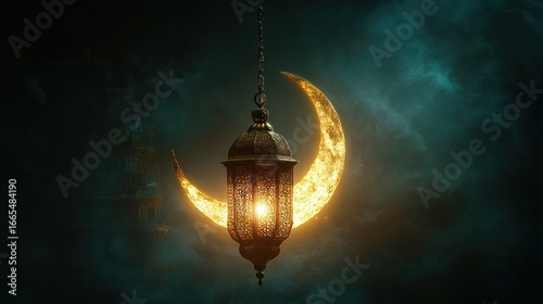 Ornate lantern hanging before a shimmering crescent moon in the night sky