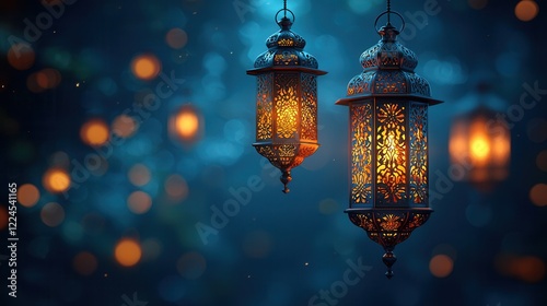 Ornate Metal Lanterns Glowing with Warm Light Against a Dark Blue Bokeh Background, Creating a Festive and Spiritual Ambiance