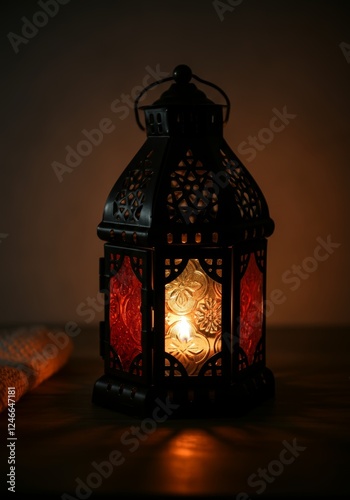 Ornate Moroccan lantern with lit candle and intricate red glass patterns in dim light