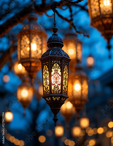 Ornate Moroccan lanterns, glowing warm light, hanging from tree branches, blue twilight background