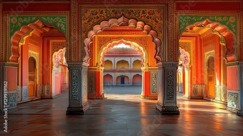 Ornate Palace Interior: Red and Gold Architecture with Intricate Archways and Detailed Pillars