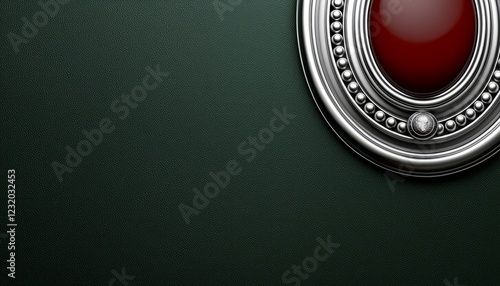Ornate Silver Frame Encircles Red Gemstone On Green