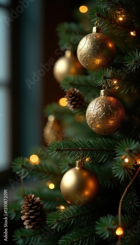 Ornate tree, gold ornaments, pine cones, warm lights, photo, classic, pine