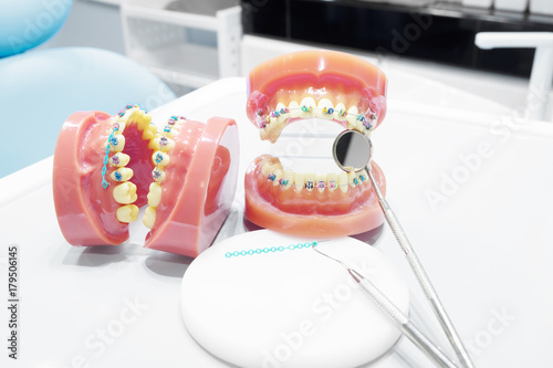 orthodontic model and dentist tool - demonstration teeth model of varities of orthodontic bracket or brace