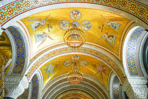 Orthodox interior with golden mosaics in Saint Sava Temple, Belgrade: decorative arches, chandeliers and icons. Symbol of cultural traditions, inspiring Christian atmosphere, Byzantine style