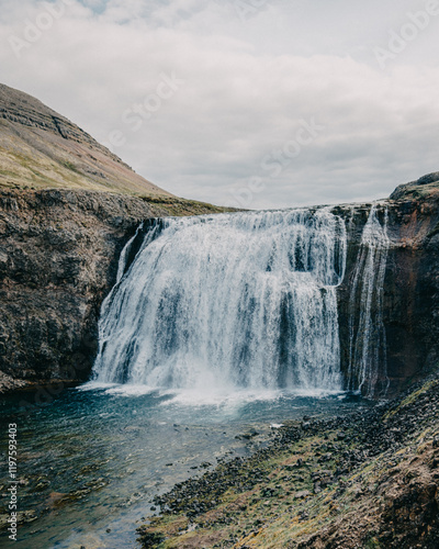 Þórufoss waterfall in south Iceland, cascading over rocky cliffs into a clear pool...