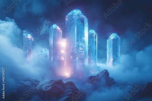 otherworldly crystalline podium emerging from misty void surrounded by floating geometric shapes bathed in ethereal blue light