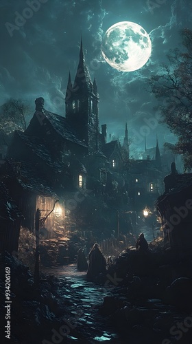 Otherworldly Figures Gather Under Enchanting Moonlight in Mysterious Town