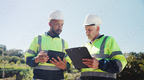 Outdoor, business people and clipboard with tablet for engineer, project development and research. Men team, contractor and mature architect with reading for construction, inspection and checklist
