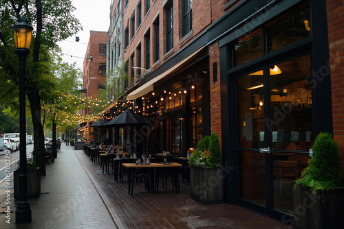 Outdoor dining area at a cozy urban restaurant on a rainy evening with string lights