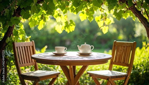 Outdoor wooden table and chairs under a leafy vine, with teacups and teapot.