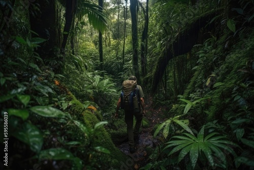 outdoorsman trekking through jungle, surrounded by lush greenery, created with generative ai