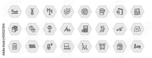 outline icons set - education concept. vector icons included swing balancer, tube, atomic theory, block with letters and more.