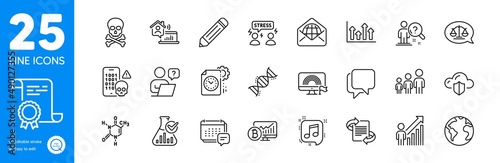Outline icons set. Upper arrows, World planet and Difficult stress icons. Employee result, Business hierarchy, Chemical hazard web elements. Cloud protection, Chemistry lab. Vector