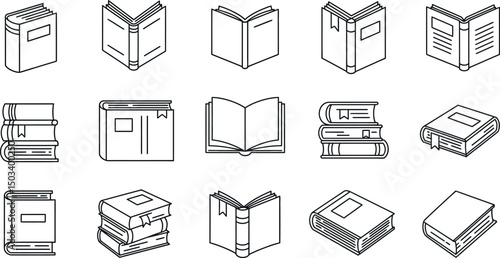 Outline illustrations of various book designs and styles