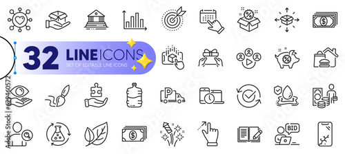 Outline set of Flood insurance, Event click and Court building line icons for web with Approved, Chemistry experiment, Puzzle thin icon. Target purpose, Payment. Design with yellow 3d stars. Vector