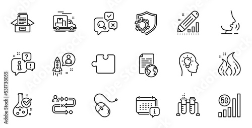 Outline set of Idea head, 5g wifi and Journey path line icons for web application. Talk, information, delivery truck outline icon. Include Documents box, Startup, Inspect icons. Vector