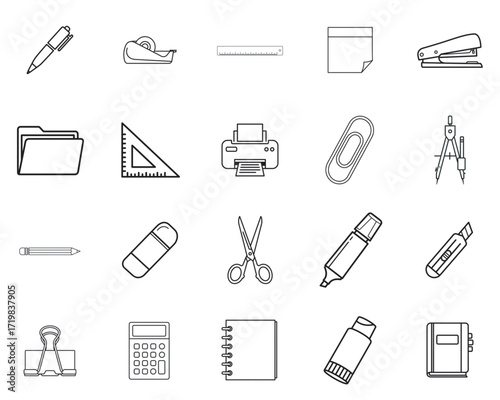 Outline style stationery and office icon set with 20 essential school work and business tools