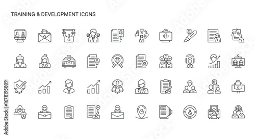 Outline style training and development symbols representing various business skills and knowledge in a modern and clean presentation.