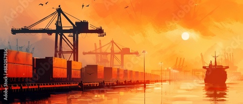 Outlined cargo spread across a shipping dock, industrial setting, sepia tones, photorealistic, high detail, dynamic composition