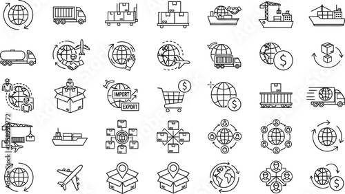 Outlined icons depicting global trade logistics and international shipping on a white background
