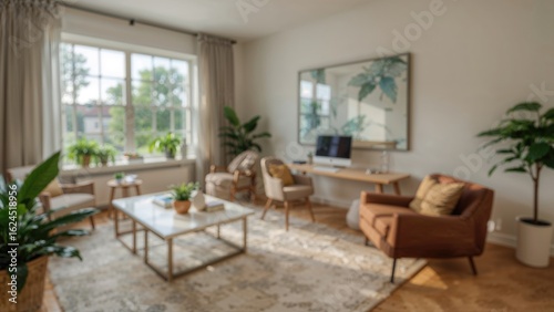 Out-of-focus image of a chic study area illuminated by daylight, featuring snug furniture and a cozy vibe perfect for both productivity and unwinding.