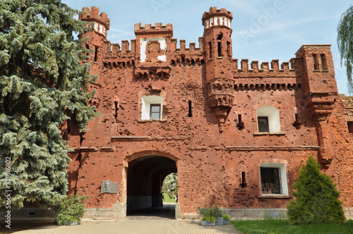 Outside Outdoor Facade Of The Kholm Gate Gates Of The Brest Fortress. Memorial Complex Brest Hero Fortress In Sunny Summer Day.