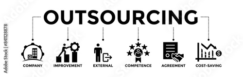 Outsourcing banner icons set. Vector graphic glyph style with icon of company, improvement, external, competence, agreement, cost-saving, and recruitment