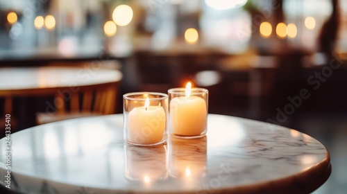 Oval marble bistro coffee table, candlelit European cafe, warm and inviting atmosphere
