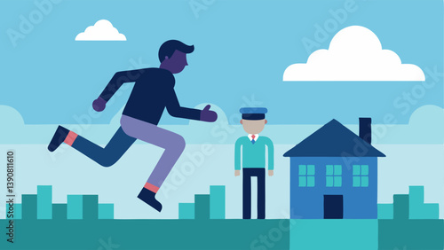 Over the Fence A fleeing suspect leaping over a low fence with a police officer hot on his heels a backdrop of suburban homes in the distance.