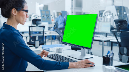 Over the Shoulder: Female Chief Engineer Working on Personal Computer, Display is Green Mock-up Screen or Chroma Key. Industrial Factory with High-Tech Machinery and Professional Workers