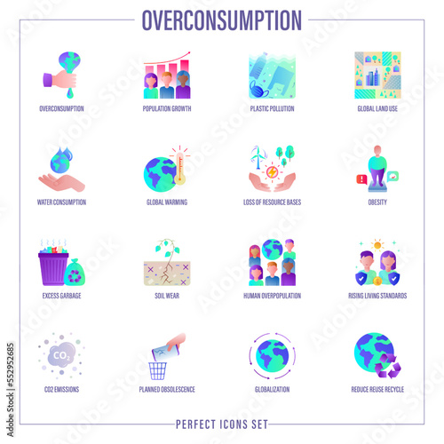 Overconsumption flat gradient icons set. Plastic pollution, population growth, obesity, global warming, excess garbage, planned obsolescene, CO2 emission, reduce, reuse, recycle. Vector illustration.