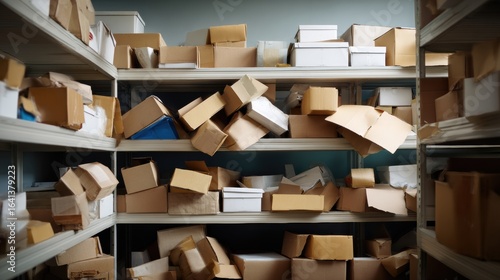 Overflowing archive shelf filled with plain boxes, creating chaotic yet intriguing scene. disarray of packaging evokes sense of curiosity and exploration