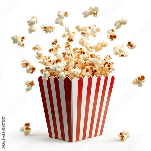 Overflowing Popcorn Container with Scattered Kernels on White Backdrop Confectionary Delight