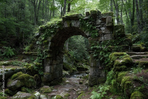 Overgrown stone arch in lush forest; creek flows below; nature reclaims ruins; mystical backdrop, ideal for fantasy or fairytale themes