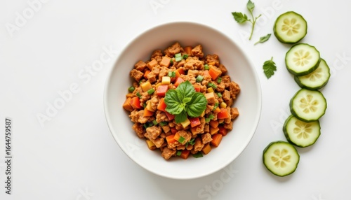 Overhead minimalist composition of larb moo (spicy minced pork salad) in a shallow white dish