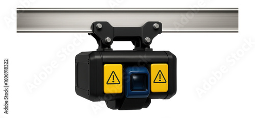 Overhead monorail system with an anti-collision safety mechanism for secure operation in a busy industrial site.