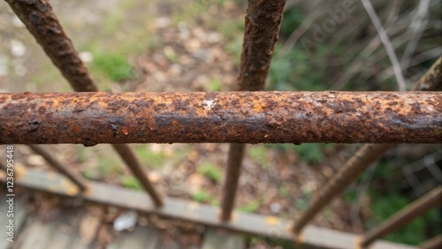 Overhead shot of a rusty metal bar with blurred surroundings and focus on the object, focused object, overhead view, weathered steel, metallic surface, industrial texture
