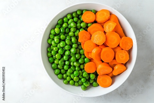 Overhead shot of fresh bright green peas and sliced carrots in bowl