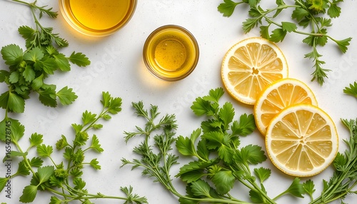 Overhead shot of fresh herbs, lemon slices, and golden liquid in small glasses, arranged on a white surface.